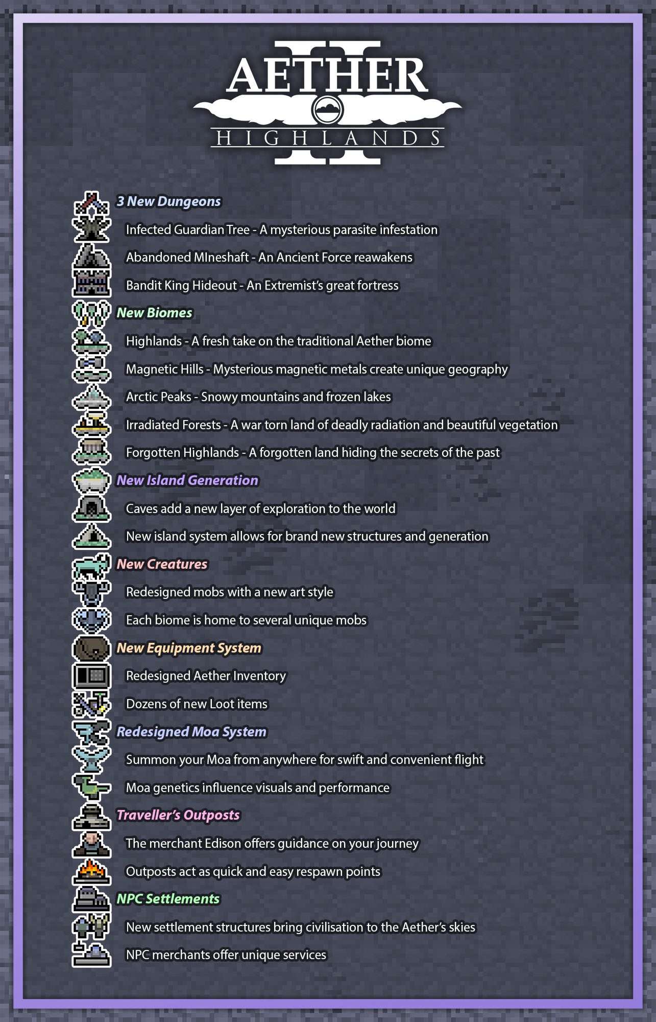 The Aether 2 has also seen a huge face-lift! New textures, mobs, blocks, and structures can be found in the hostile paradise that is the Aether.