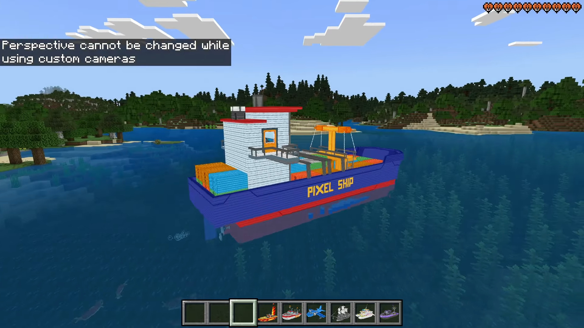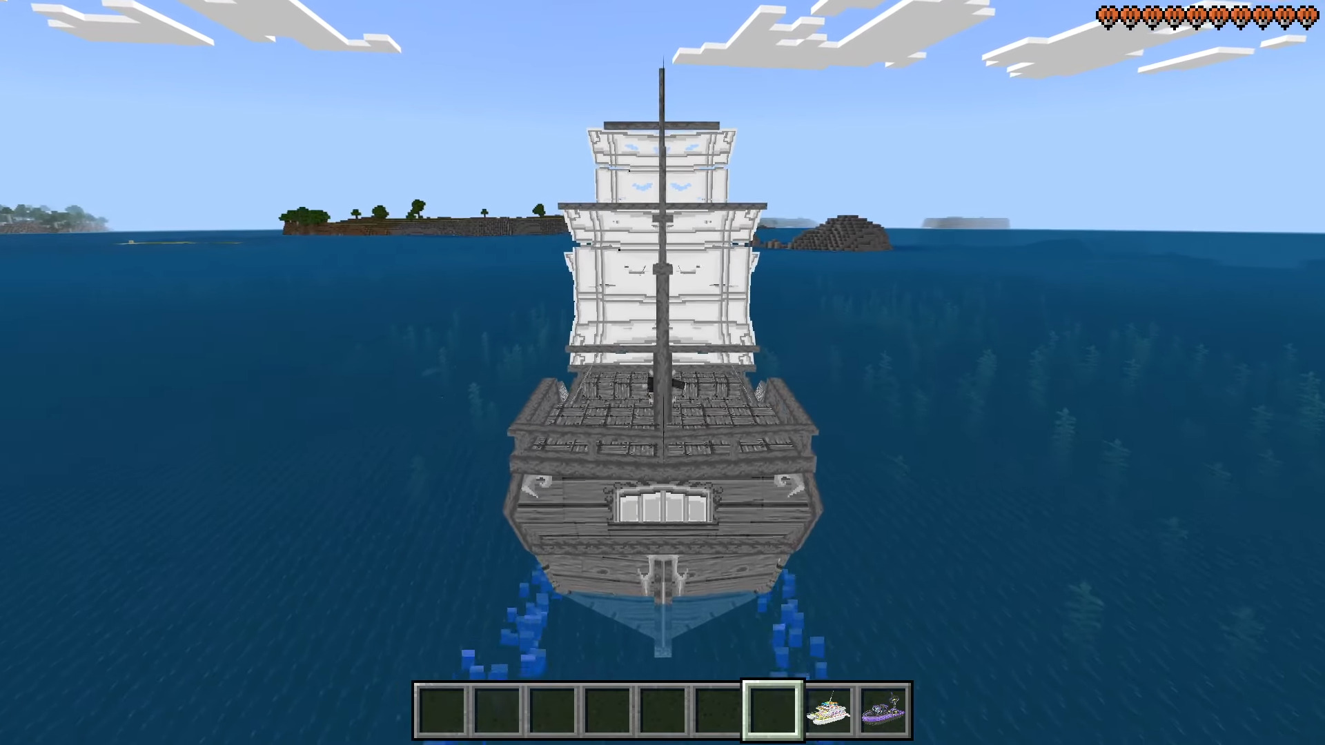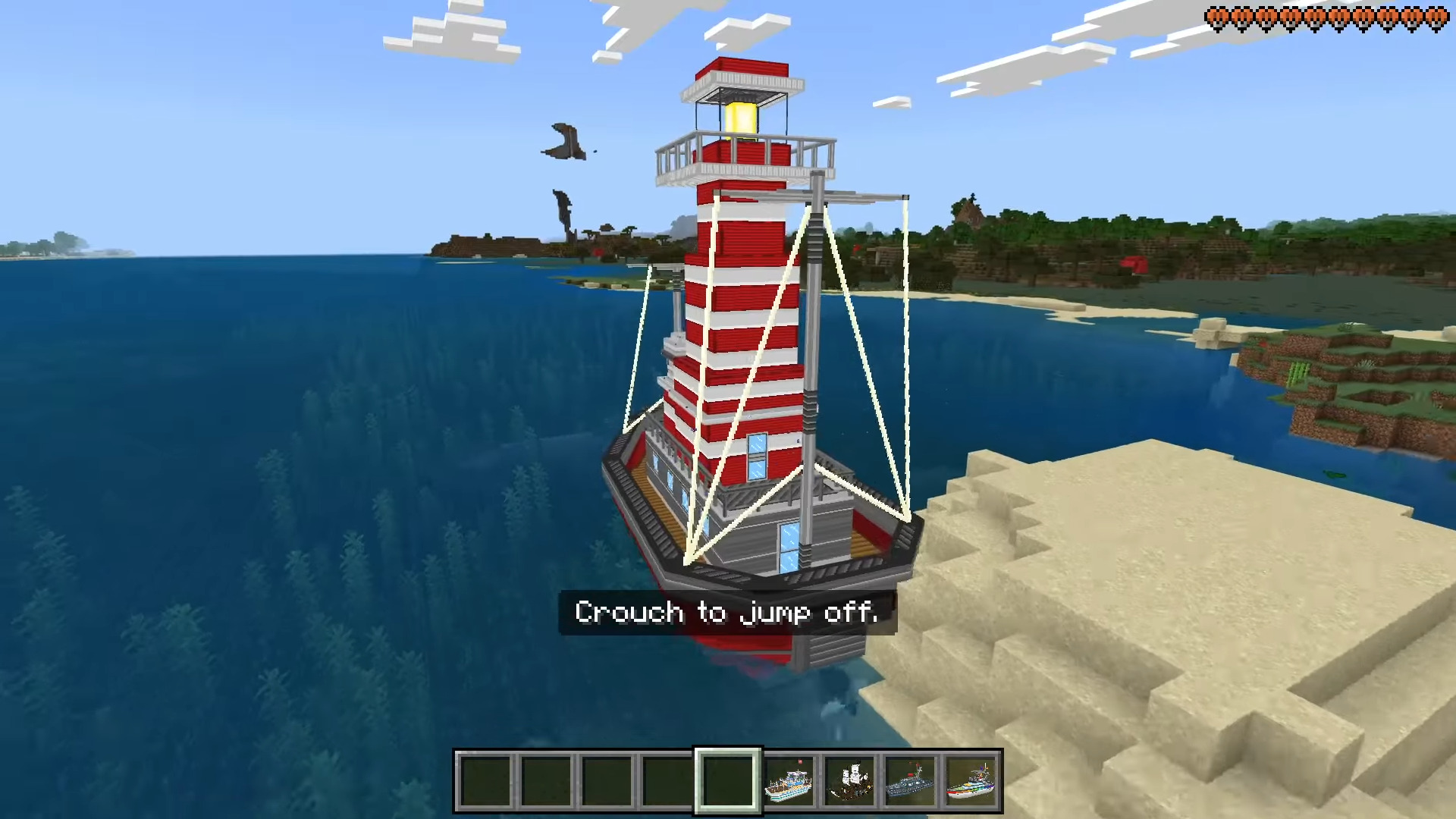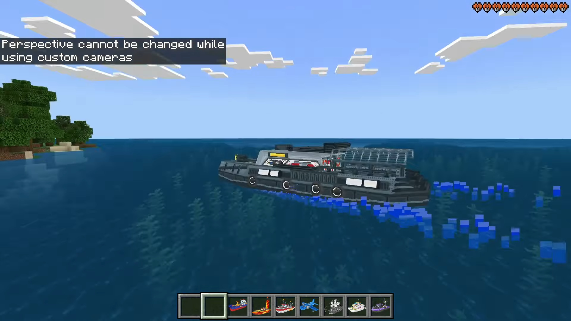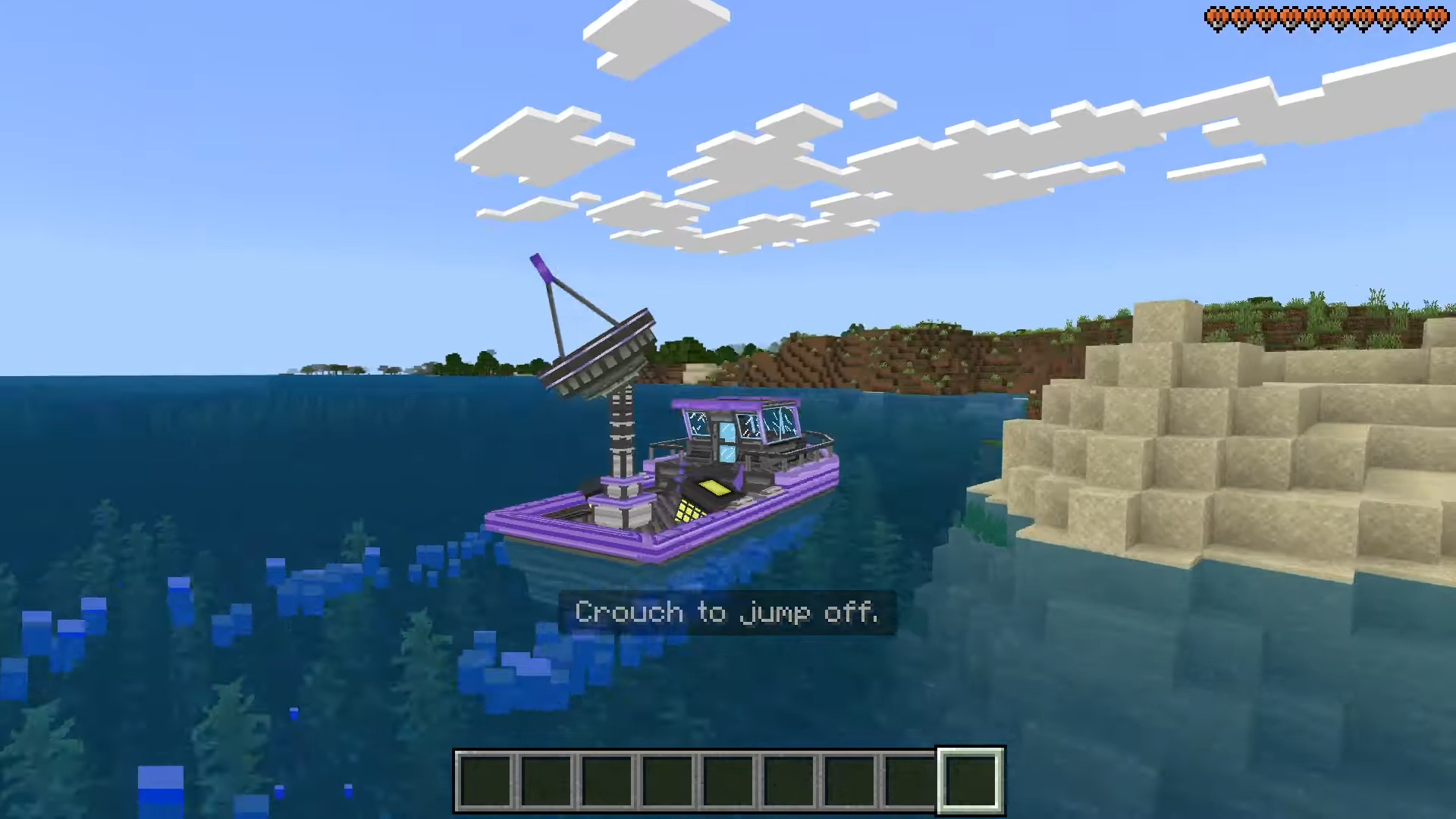 Boats ++ Map (1.21) features 25 craftable and interactive boats designed to enhance adventures with dynamic gameplay, including submarines, pirates, fishing mechanics, flying boats, teleporting, and ice-breaking capabilities. Each boat has amazing interactive abilities, RGB lights, cannons, and beacons.