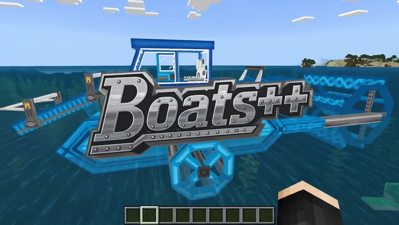 Boats ++ Map (1.21) features 25 craftable and interactive boats designed to enhance adventures with dynamic gameplay, including submarines, pirates, fishing mechanics, flying boats, teleporting, and ice-breaking capabilities. Each boat has amazing interactive abilities, RGB lights, cannons, and beacons.