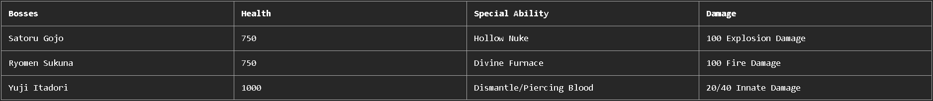 - /startevent Ryomen_Sukuna/Satoru_Gojo/Yuji_Itadori – Start a boss fight.