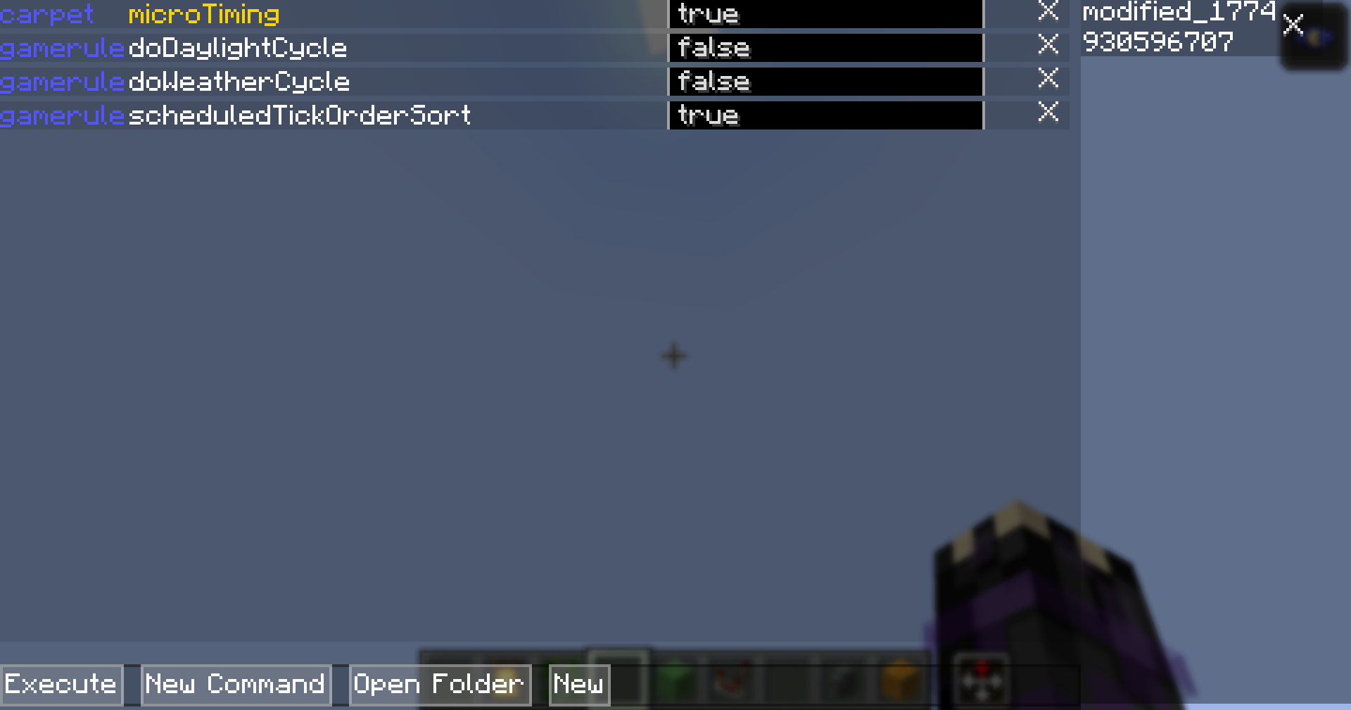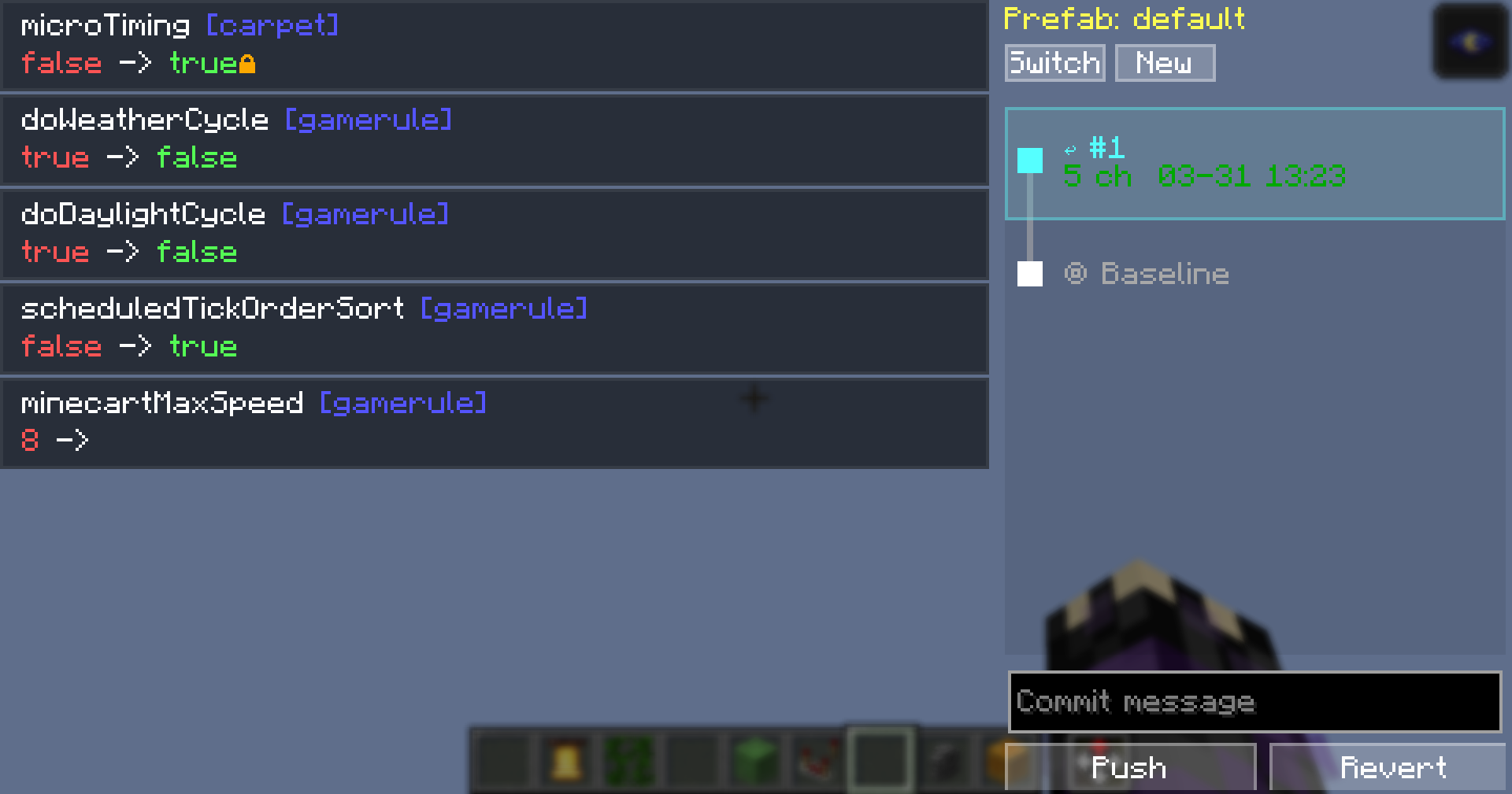 Carpet Mod Rule Management GUI Mod adds three powerful menus to help you manage Carpet Mod rules easily. It gives you visual tools to browse rules, save configurations, and track changes without typing commands.
