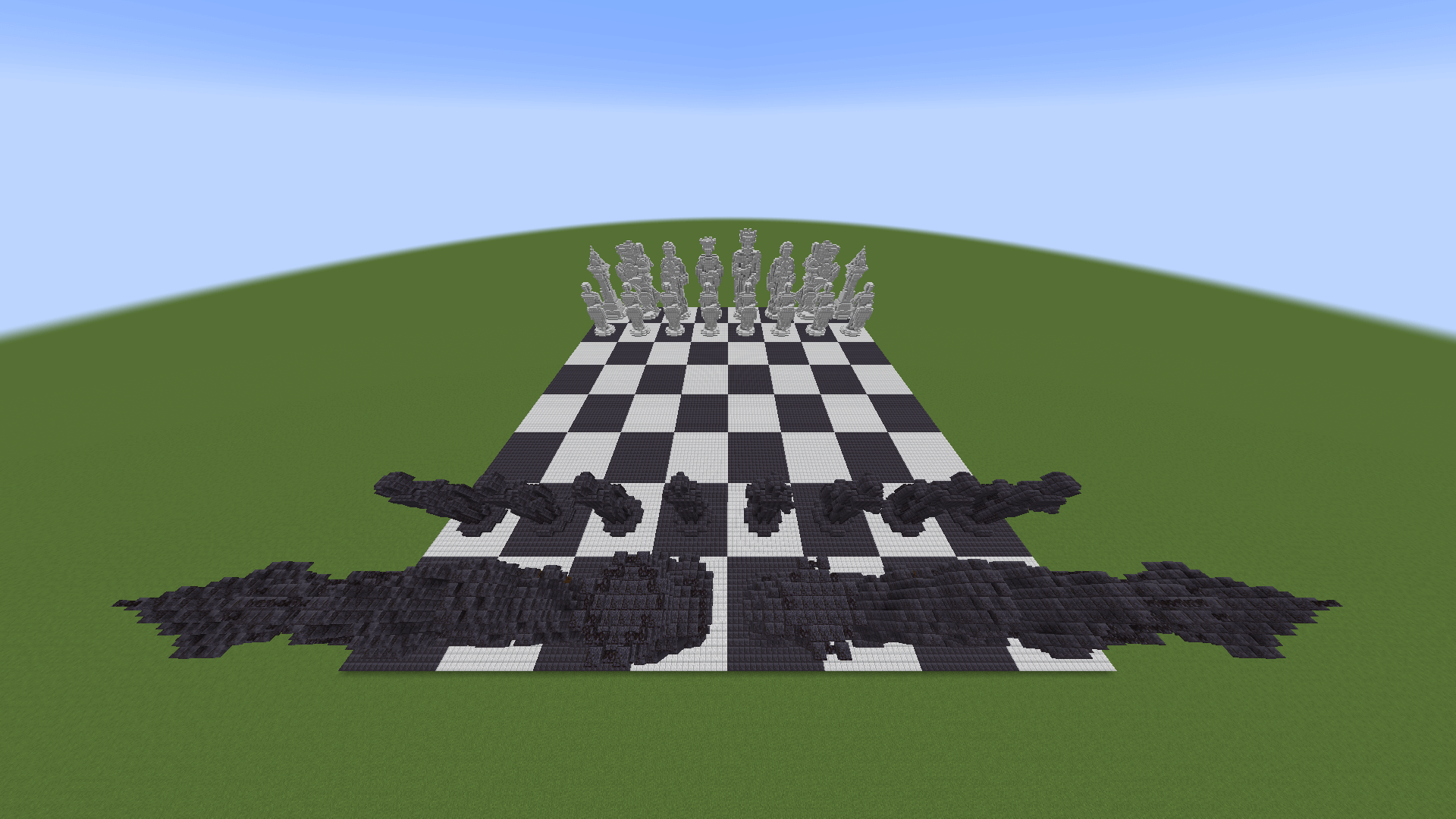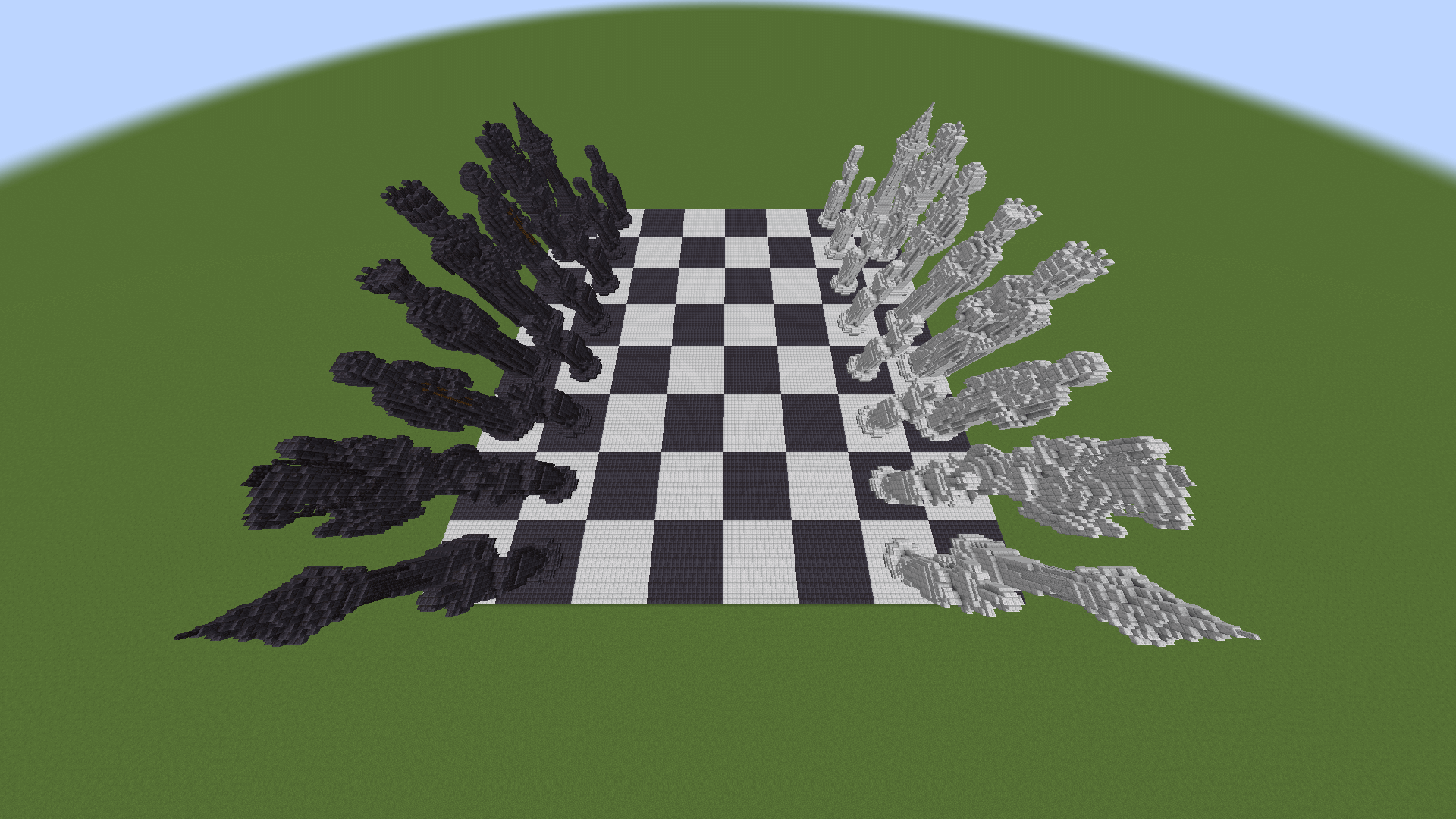 Chess brings a giant playable chess board to Minecraft. This massive map features a full 136×136 block board with 17×17 block squares, built using polished diorite and blackstone. You can move the chess pieces using mods like Litematica, WorldEdit, or Axiom.