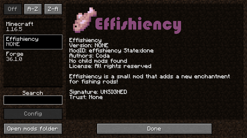 - Effishiency is a small mod that adds a single new enchantment. This enchantment can rarely be obtained from enchanting tables, and is only applicable to fishing rods.