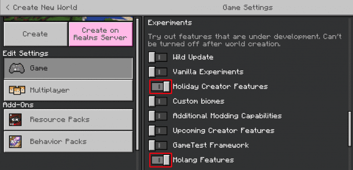 - Make sure to turn on “Holiday Creator Features” and “Experimental Molang Features!”