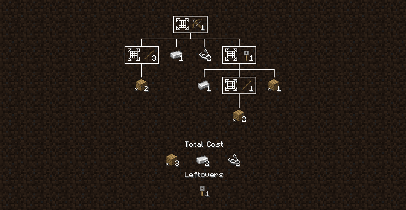 - A recipe tree for breaking down the cost of a complex craft, showing you every step, how many base ingredients you need, and what you’ll have leftover