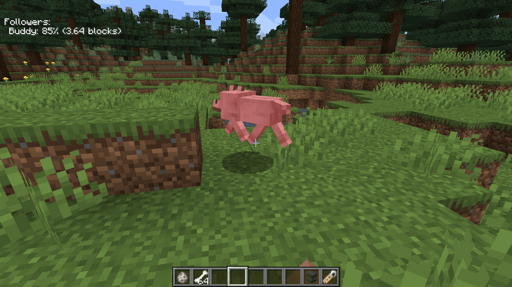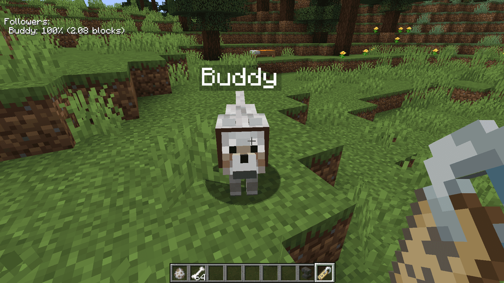 - IT also shows the health of the follower as a percentage, and how many blocks it is away from the player.