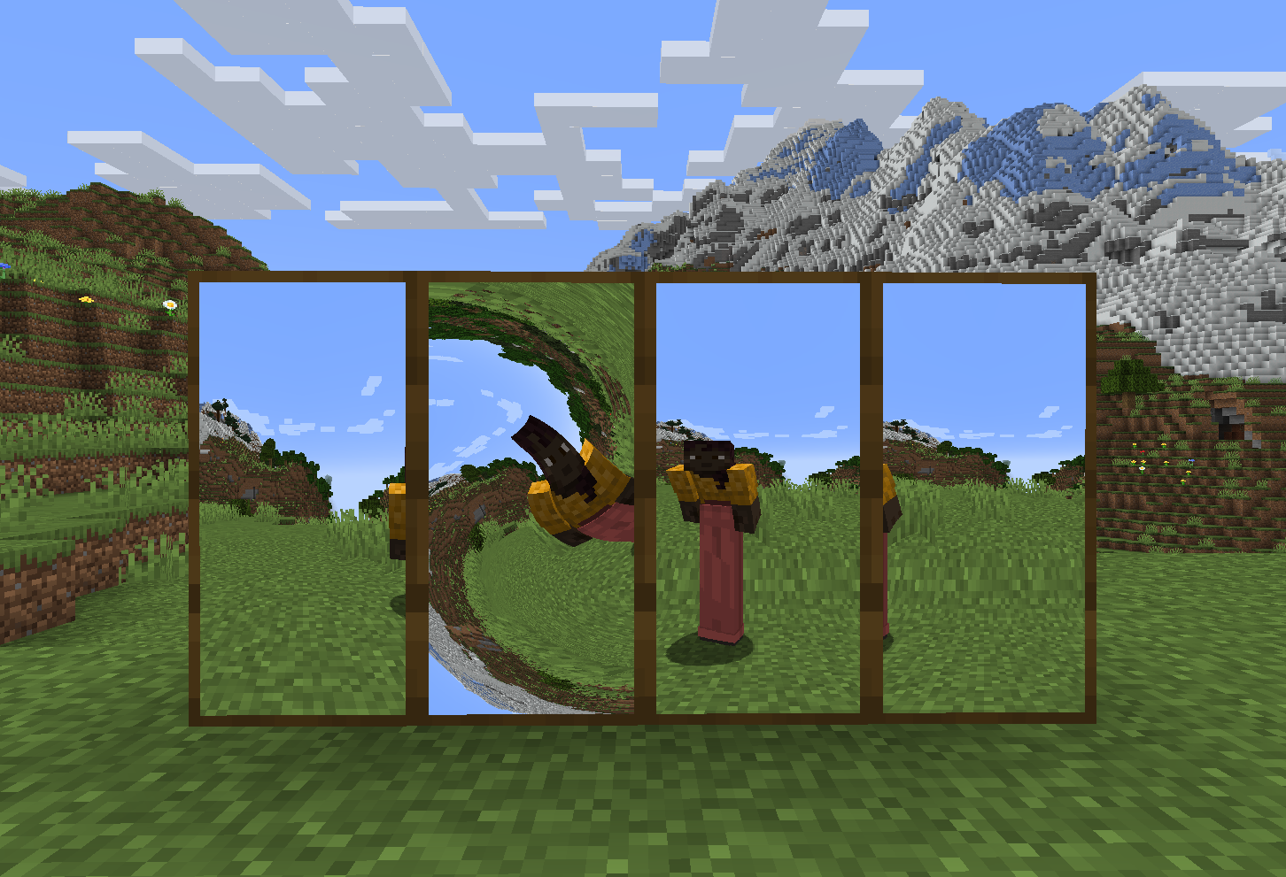 Illusions Mod [1.21.1, 1.21] adds mirrors to the game! There are a total of four mirrors: one regular and three curved, reflecting the world in various distorted forms—whether it’s vortex distortion, vertical, or undulating.
