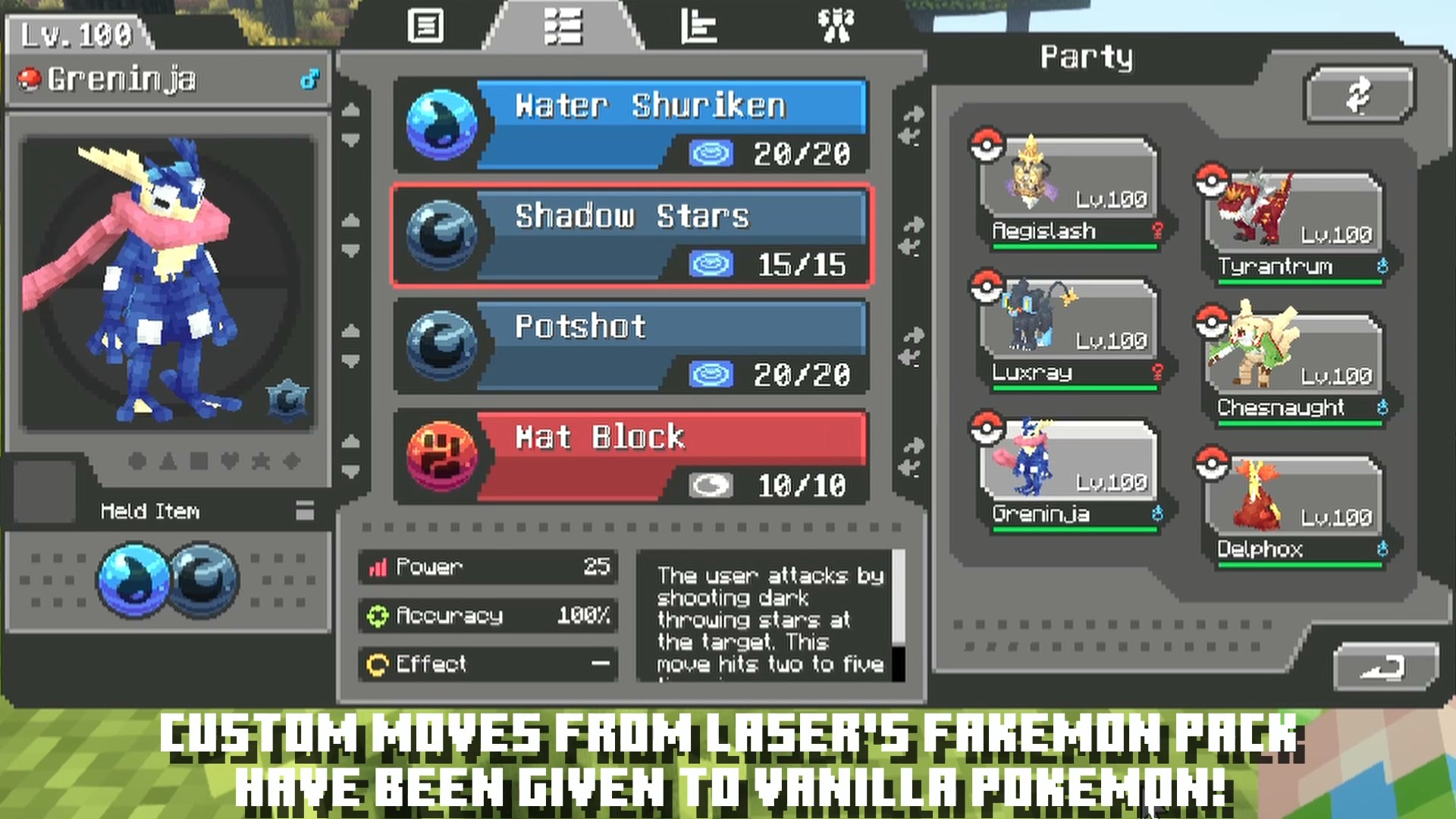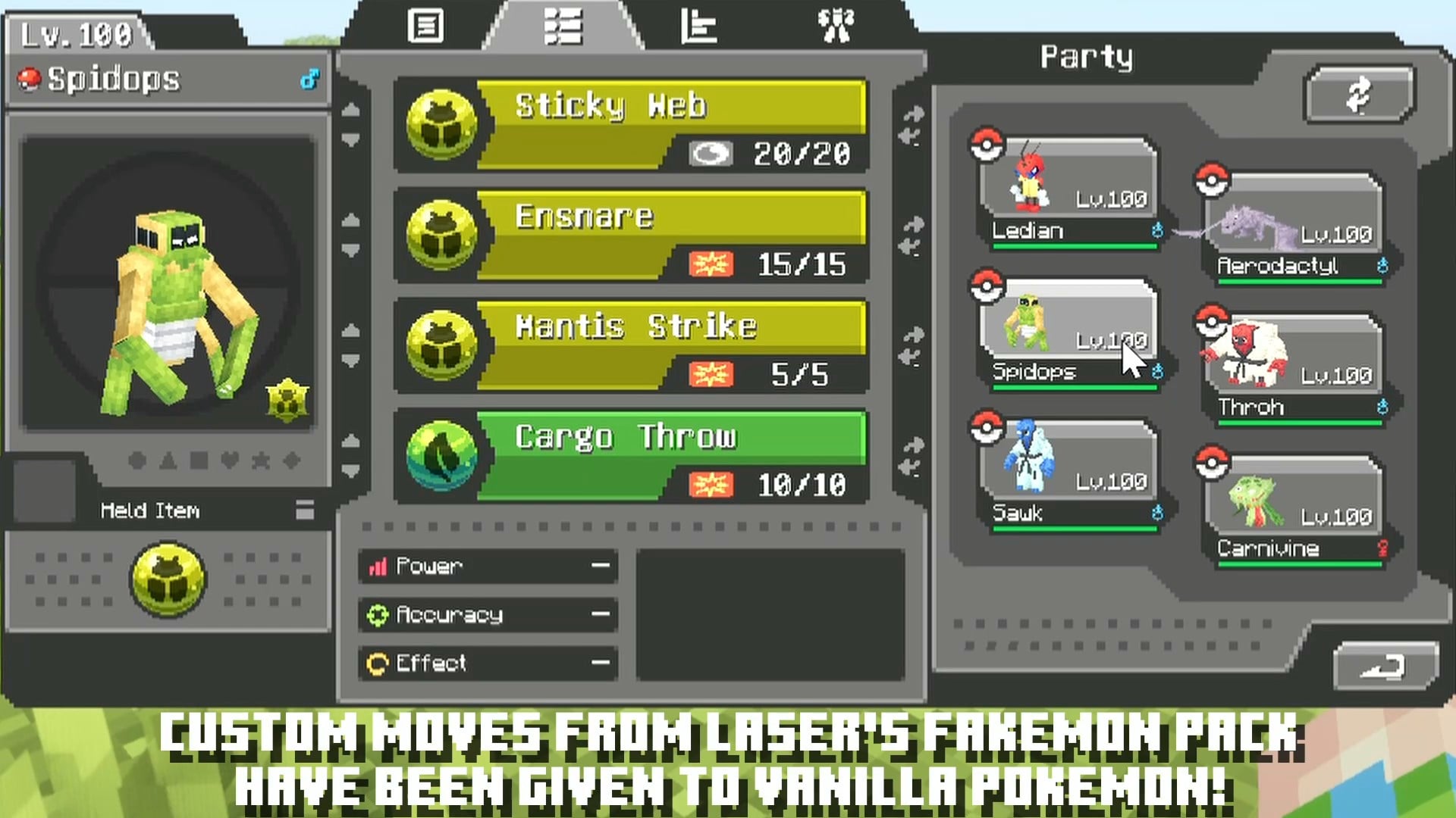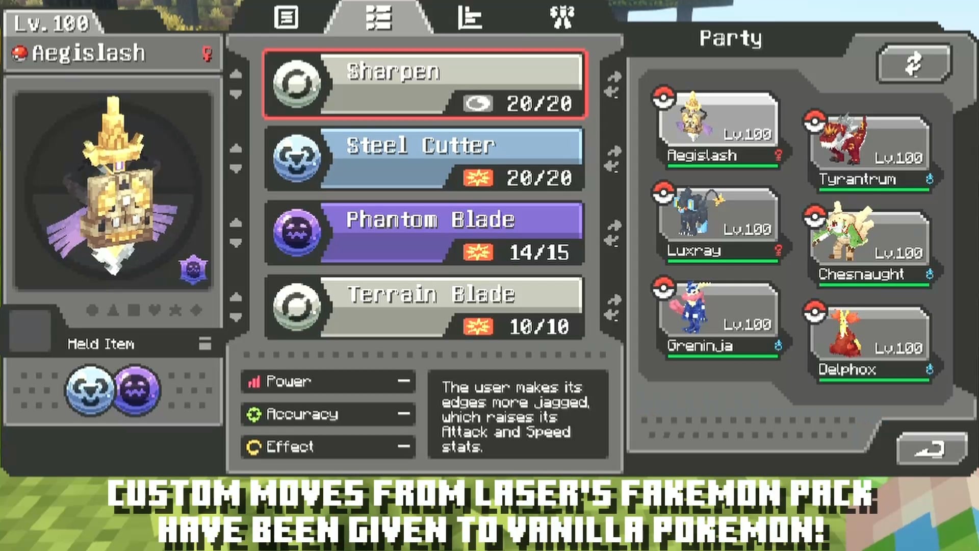Laser’s Additions [Cobblemon] adds custom moves from Laser’s Fakemon Pack to vanilla Pokemon species. The mod also makes a ton of buffs, nerfs, and tweaks to moves and abilities. It includes new move categories for Kicking, Throwing, Hammer, Beam, and Light moves.