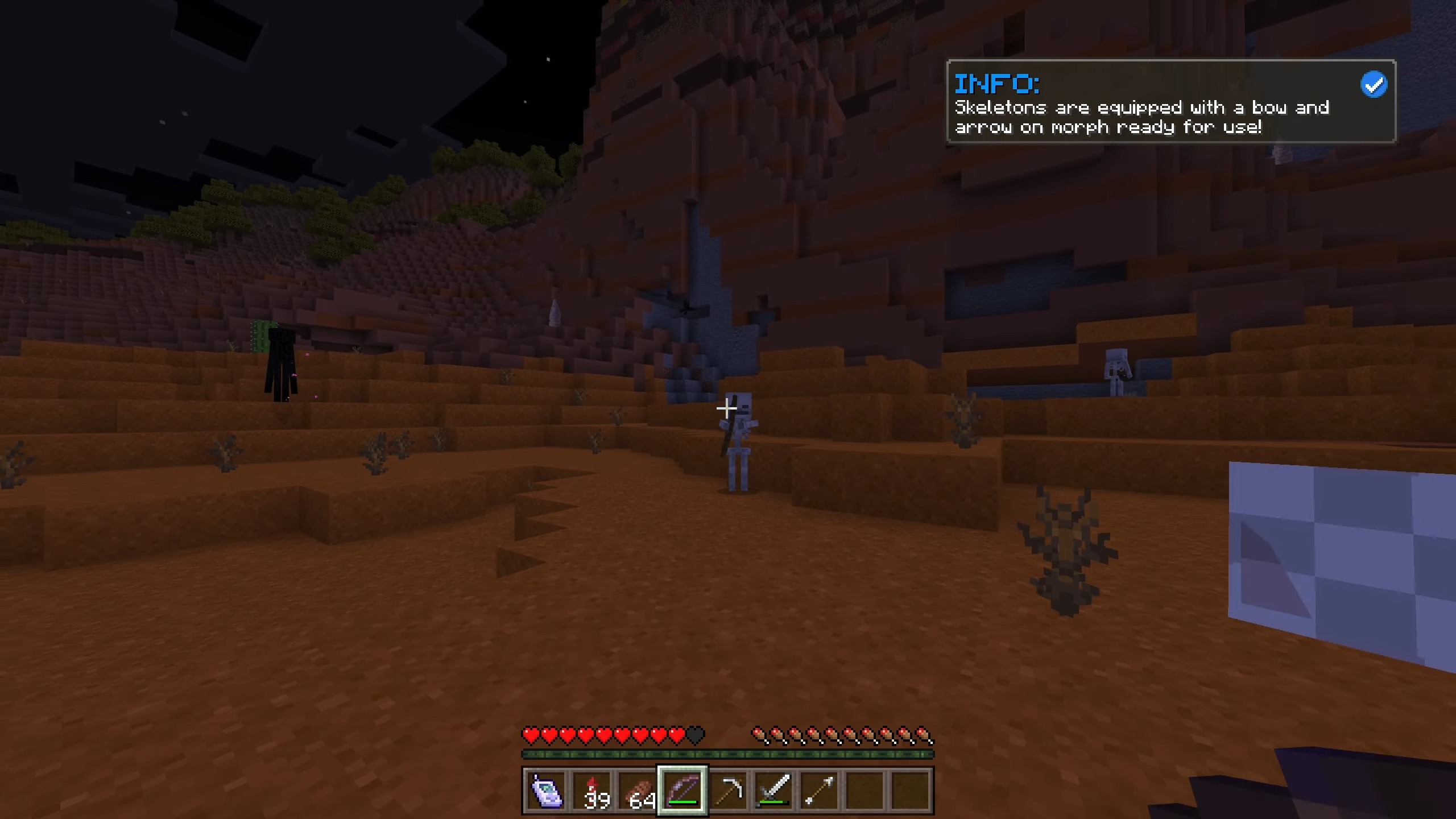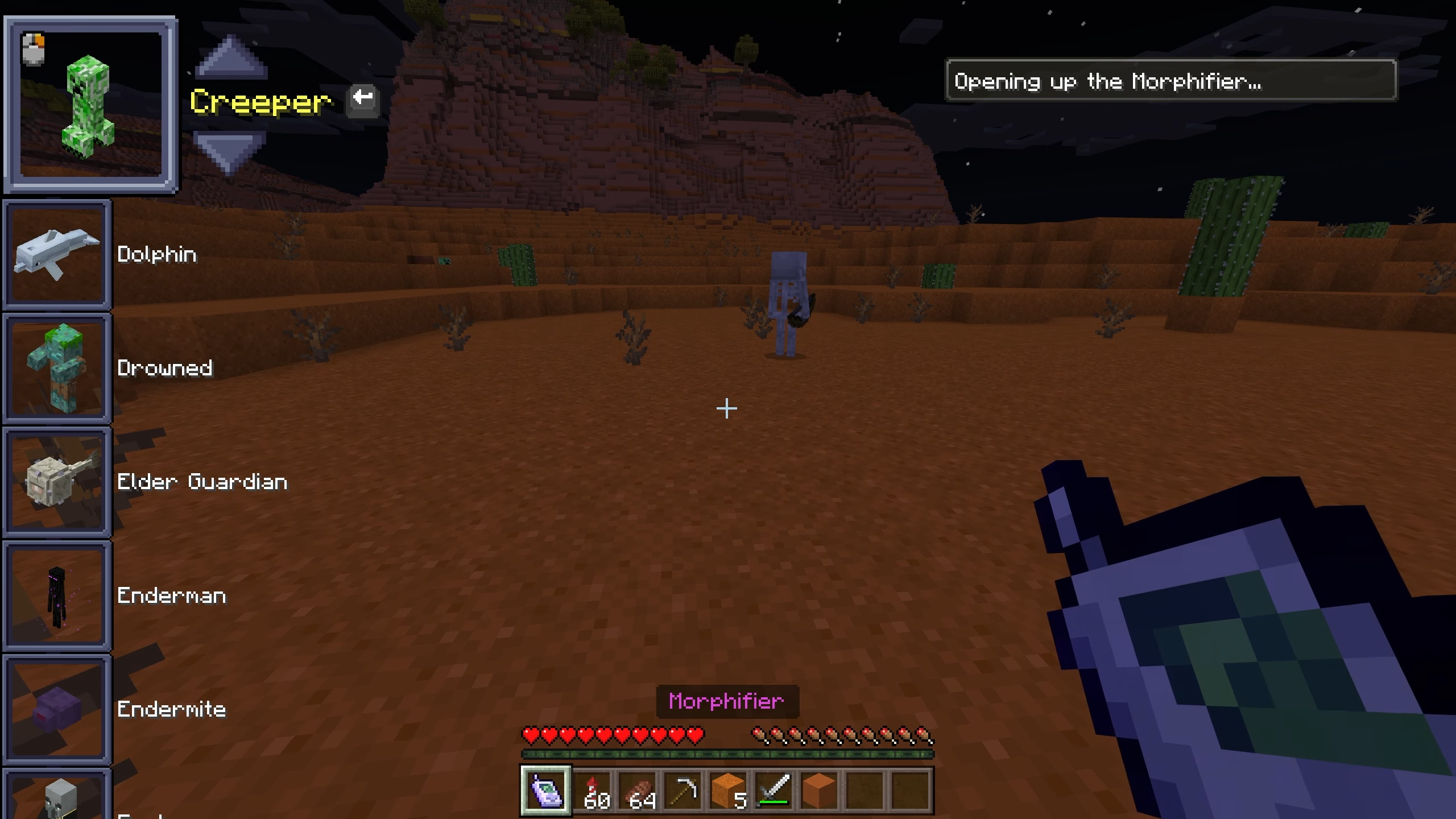 The Morph Pack lets you transform into over 250 different mobs, from mighty red dragons to playful dogs, squirrels, and even the latest 1.19 creatures. Each morph comes with its own unique abilities, and with tools like the Baby Tool to shrink down, the Color Switch Tool to change appearances, and a handy morph menu screen, you can easily swap forms and play however you like. With both custom and vanilla mobs available—plus craftable morphs for survival—this pack gives you endless ways to experience Minecraft from an entirely new perspective.