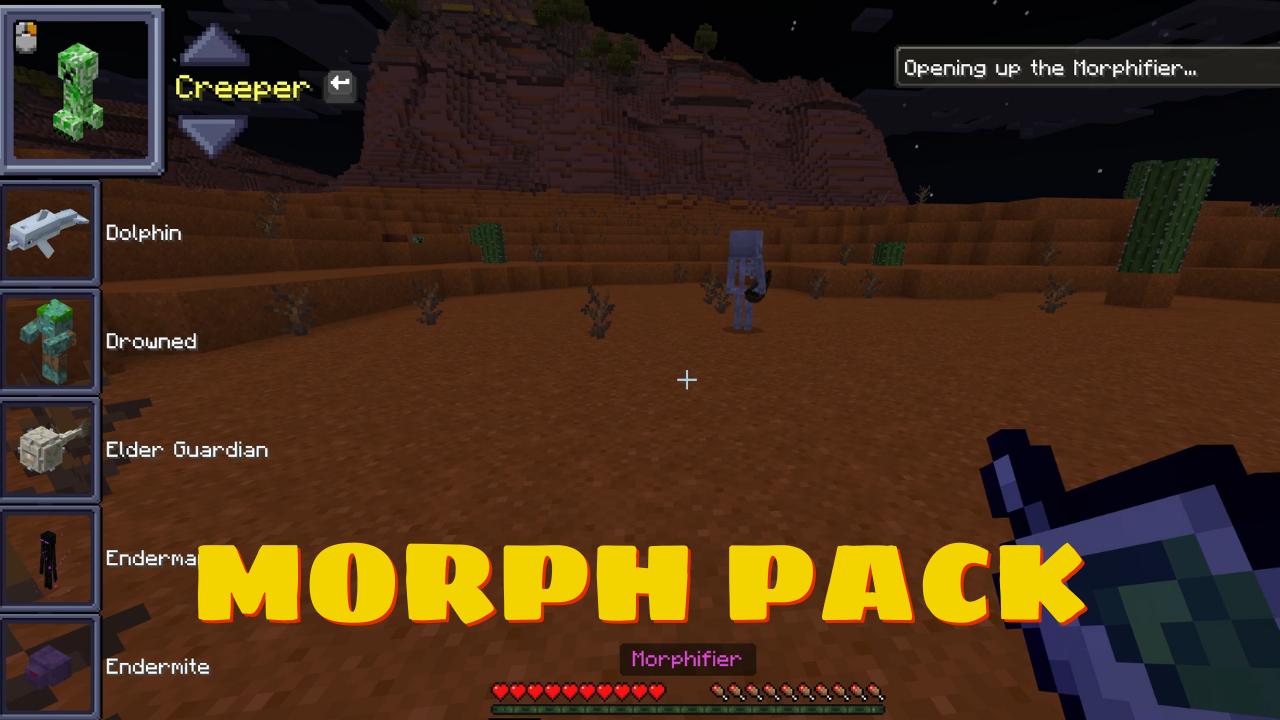 The Morph Pack lets you transform into over 250 different mobs, from mighty red dragons to playful dogs, squirrels, and even the latest 1.19 creatures. Each morph comes with its own unique abilities, and with tools like the Baby Tool to shrink down, the Color Switch Tool to change appearances, and a handy morph menu screen, you can easily swap forms and play however you like. With both custom and vanilla mobs available—plus craftable morphs for survival—this pack gives you endless ways to experience Minecraft from an entirely new perspective.