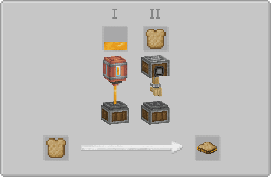 The Sandwiching Station cannot easily be automated. Sandwiches can instead be automated using Create, when it is installed. The mechanical saw can be used to automatically cut bread, and deployers can add ingredients to sandwiches. Spouts can also be used to apply some supported fluids on your sandwiches, so you don’t have to deal with empty fluid containers clogging up your conveyor belts.