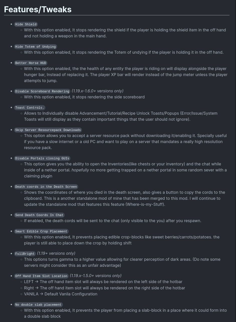 SomeOrdinaryTweaks is a mod that adds a few GUI/HUD/Rendering Tweaks and gives the ability to turn off selective toast groups (tutorial/advancement/recipe unlock popups), also includes few misc features. every feature will be listed down below