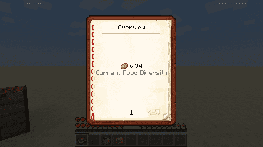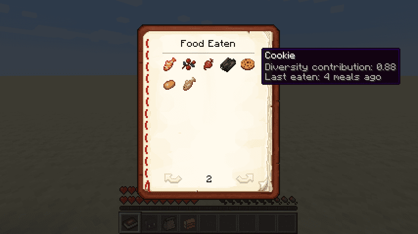 • This mod keeps track of the past 32 (configurable) foods you’ve eaten, and assigns a diversity score based on how diverse those foods are. The greater the variety of foods you’ve eaten, the higher your diversity score is, with a greater weight on recently eaten foods. You are then given various benefits depending on how high your current diversity score is.