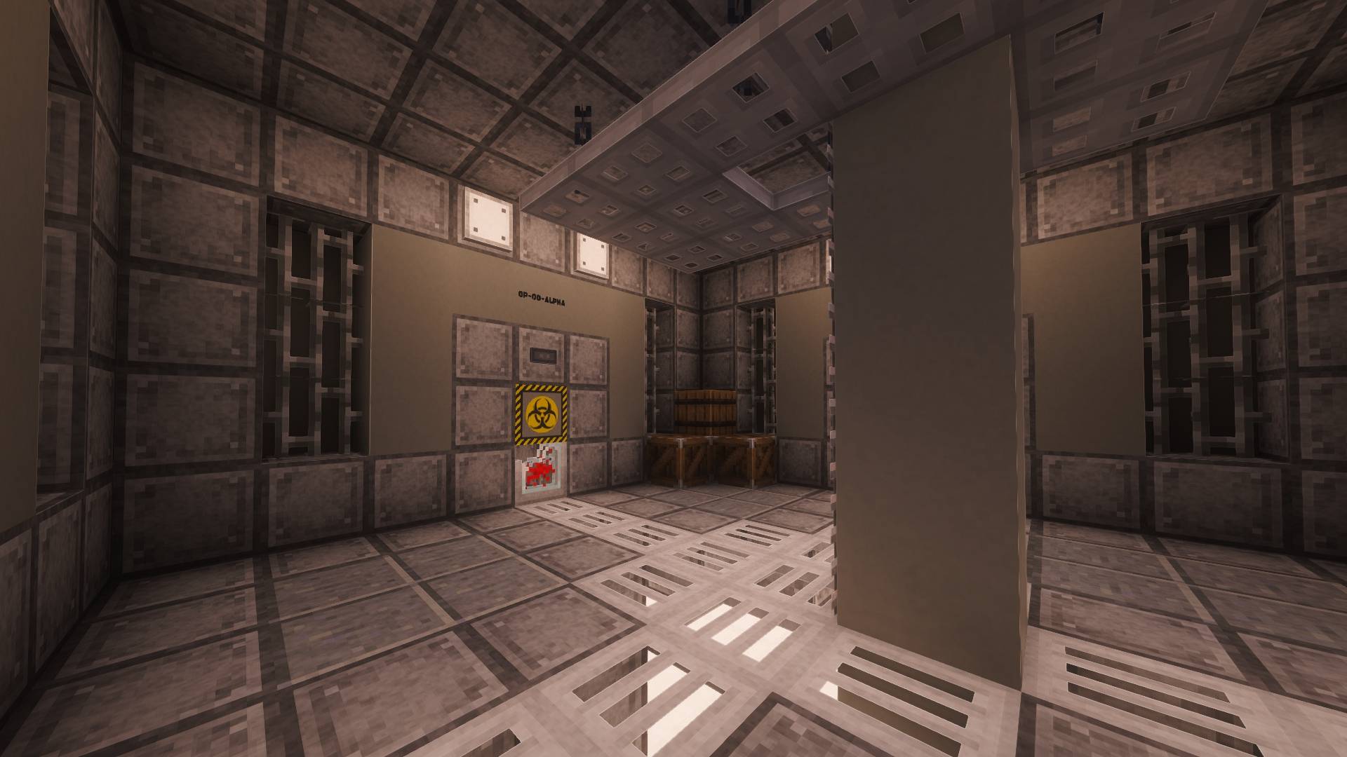 - Bunker blocks include airlock doors, motion sensors, and lighting.