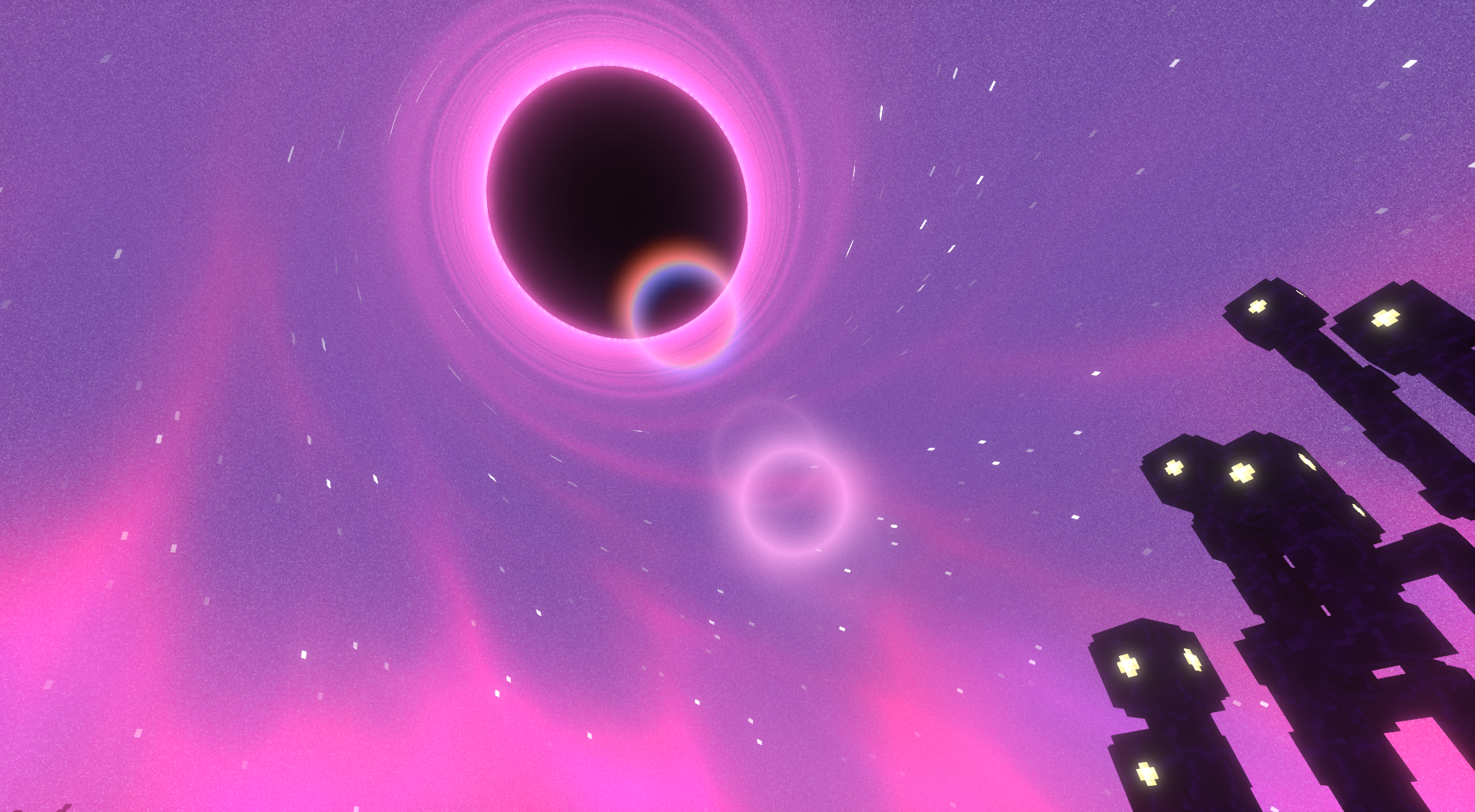 - The End’s black hole is purply-pink with pink spirals.